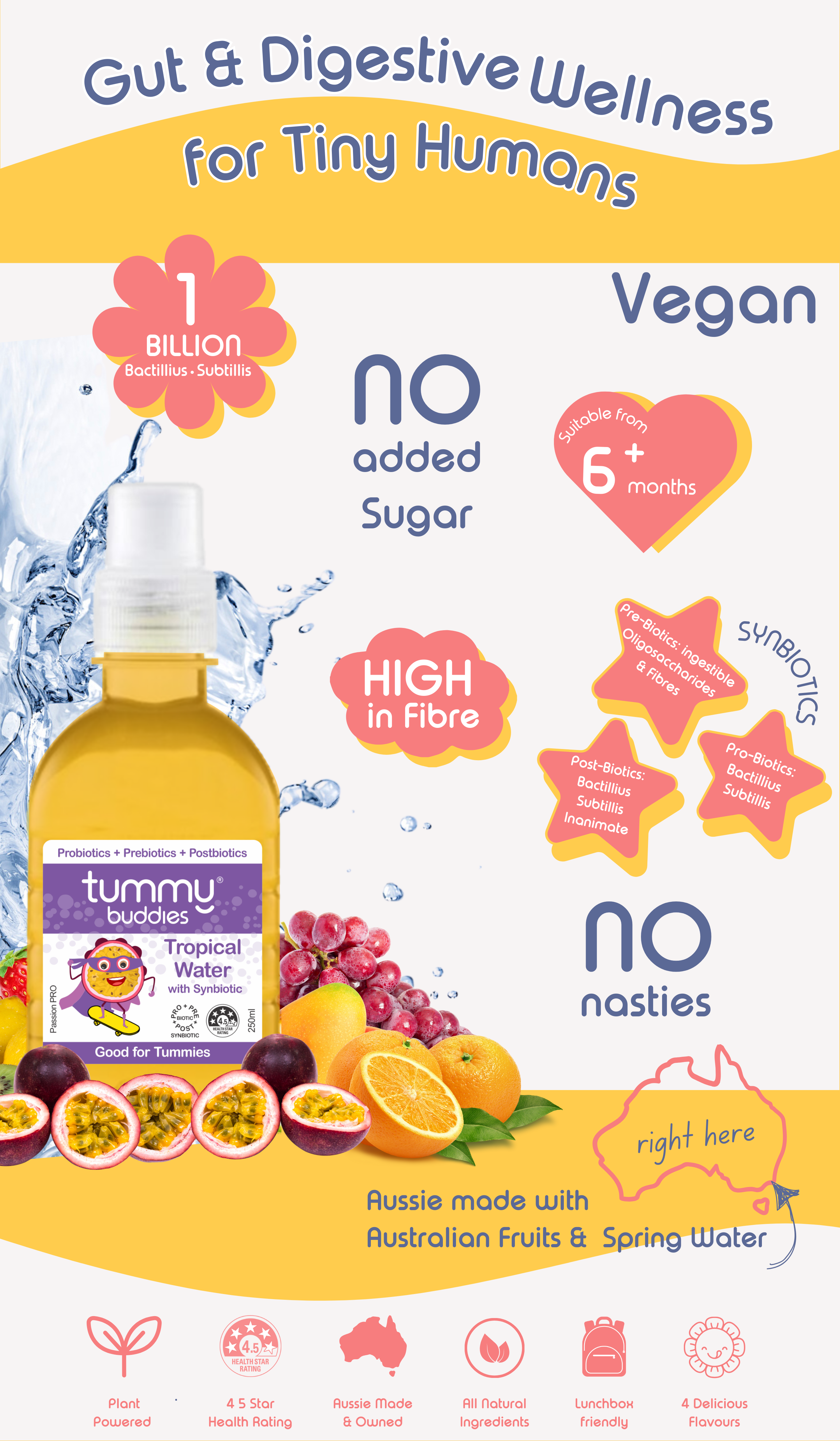 Blended with pure Tasmanian spring water and bio-az synbiotic advantage, 'Tummy buddies empowers parents with a natural way to improve any child's wellbeing.